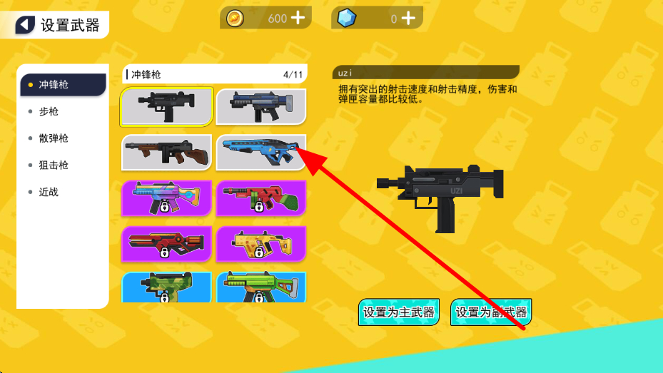 2、进入设置武器,有冲锋枪、步枪等多种类型武器可供选择,根据不同武器的射击速度、伤害等属性,挑选适合自己战斗风格的武器。