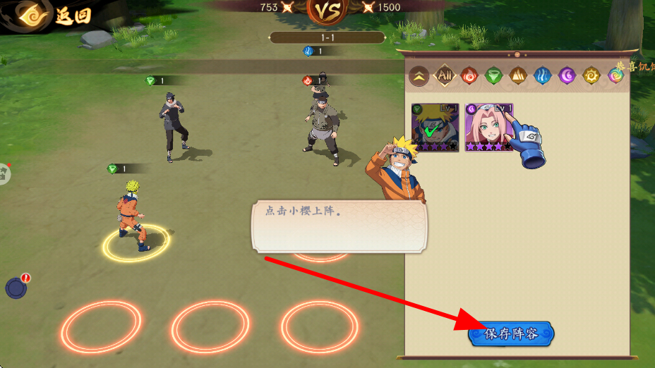 2、进入战斗准备界面,可选择合适的忍者上阵,搭配出契合当前战斗的阵容,之后点击保存阵容,确定上阵的忍者组合。