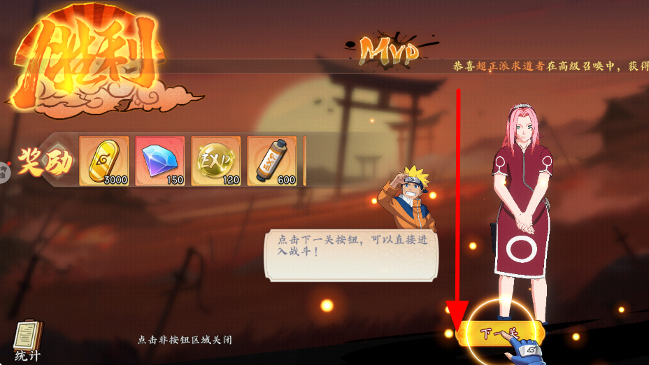 4、成功击败敌人,达成关卡胜利后,点击下一关,即可进入后续关卡,继续冒险,挑战更强的敌人,获取更多奖励。