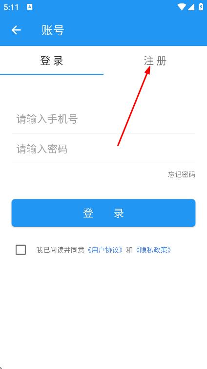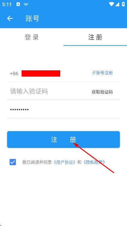4、填写手机号、验证码、密码,点击注册,完成账号注册。