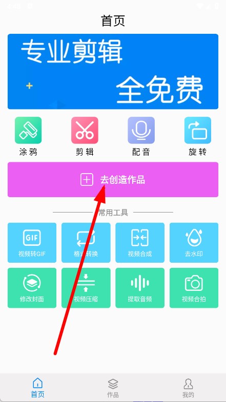 1、打开视频剪辑宝APP,在首页点击去创造作品。