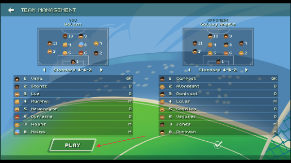 1、进入足球游戏主界面,选择心仪的赛事模式,确定己方要使用的球队,调整球员的首发阵容和场上站位,检查球员的体力与状态,为即将开启的赛事做好全面准备。