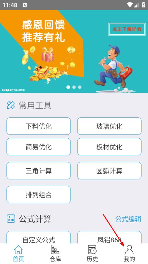 1、打开下料优化大师,点击页面右下角的我的,进入个人页面。