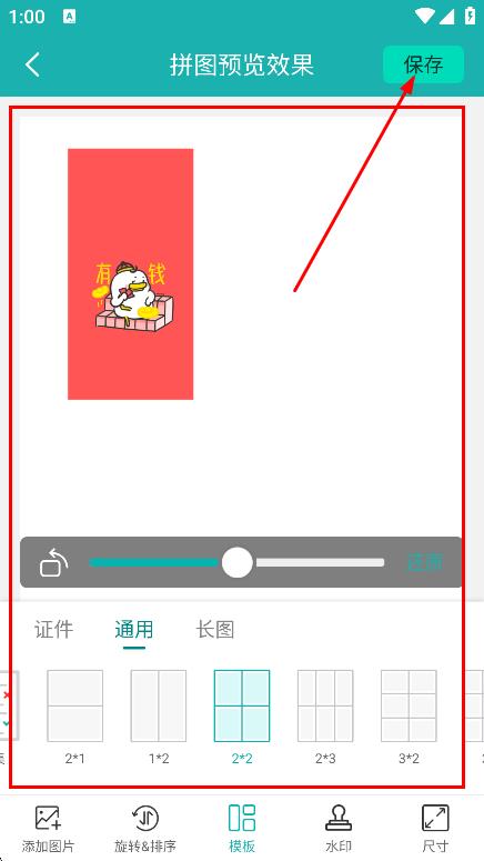 4、在拼图预览效果页面,调整拼图参数后,点击保存,保存拼图。