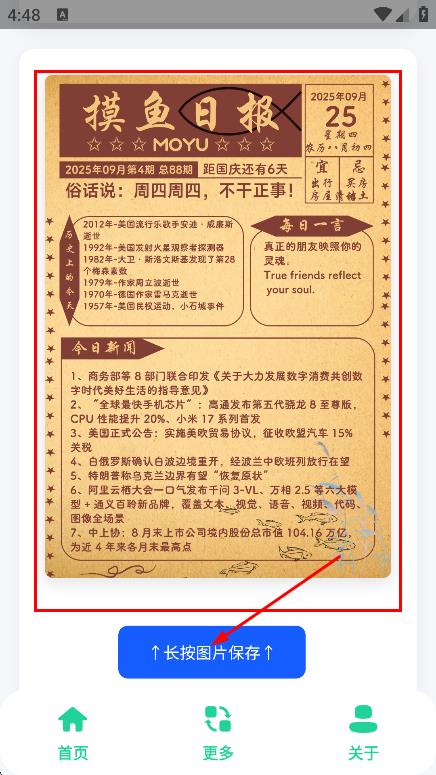 4、最后在生成摸鱼日报后,长按图片可保存该日报。