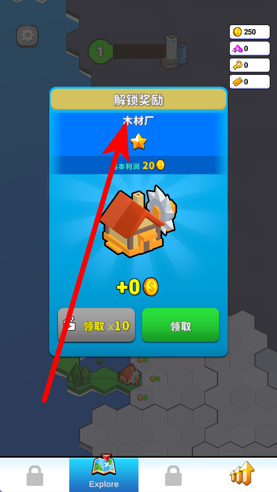 1、当出现解锁奖励提示时,比如解锁木材厂,可查看相关奖励内容,然后点击领取按钮,获取对应的奖励,这些奖励能为后续建设提供助力。