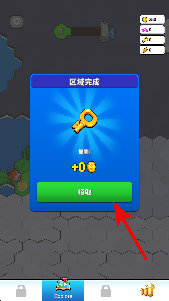 2、完成区域建设后,会有区域完成的提示,此时点击领取按钮,可获得相应报酬,积累资源用于其他区域的开发与建筑解锁。