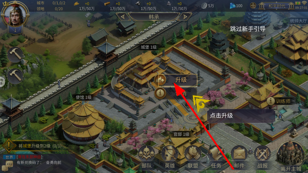 2、进入游戏后,对城堡进行升级,点击城堡上的升级按钮,提升城堡等级,以此解锁更多功能与资源,增强自身实力。