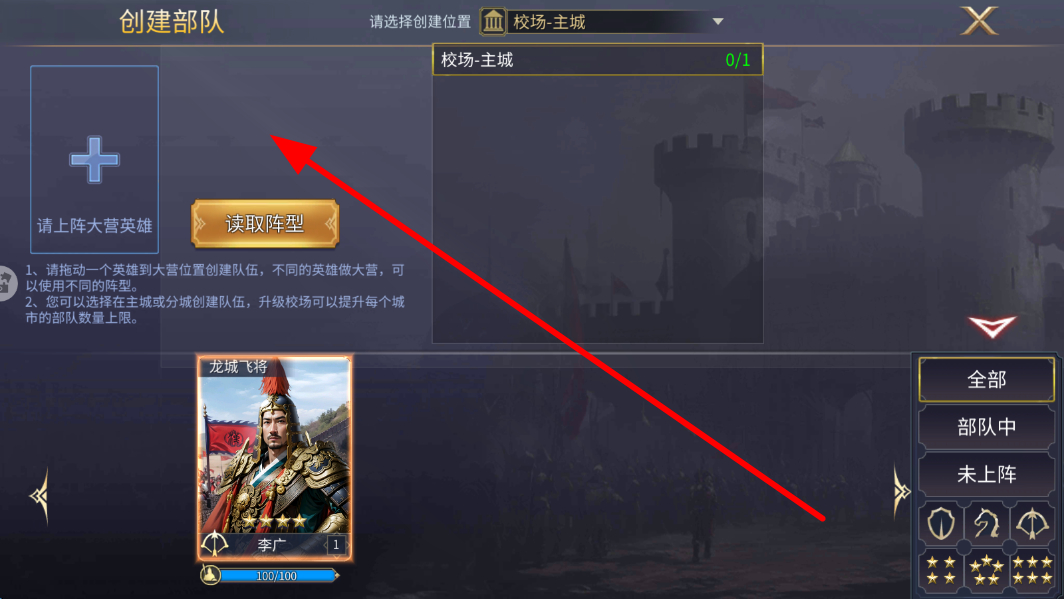 3、前往创建部队界面,拖动英雄到大营位置创建队伍,还可选择读取阵型,合理搭配英雄与阵型,打造强大的部队。