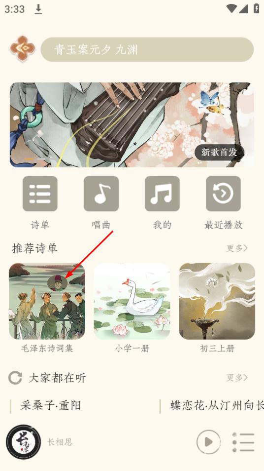 2、进入音频页面,在推荐诗单中点击毛泽东诗词集。