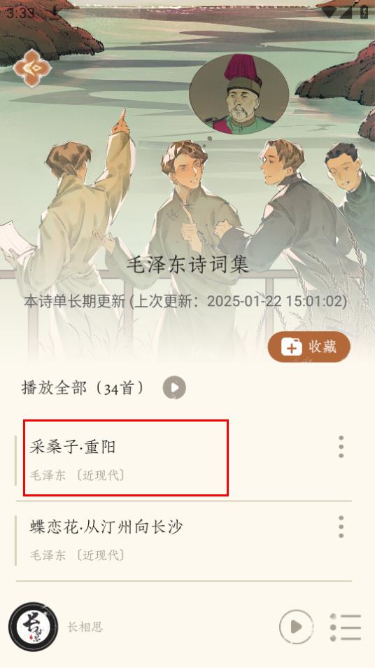 3、在毛泽东诗词集页面,点击想听的音频,如采桑子重阳。