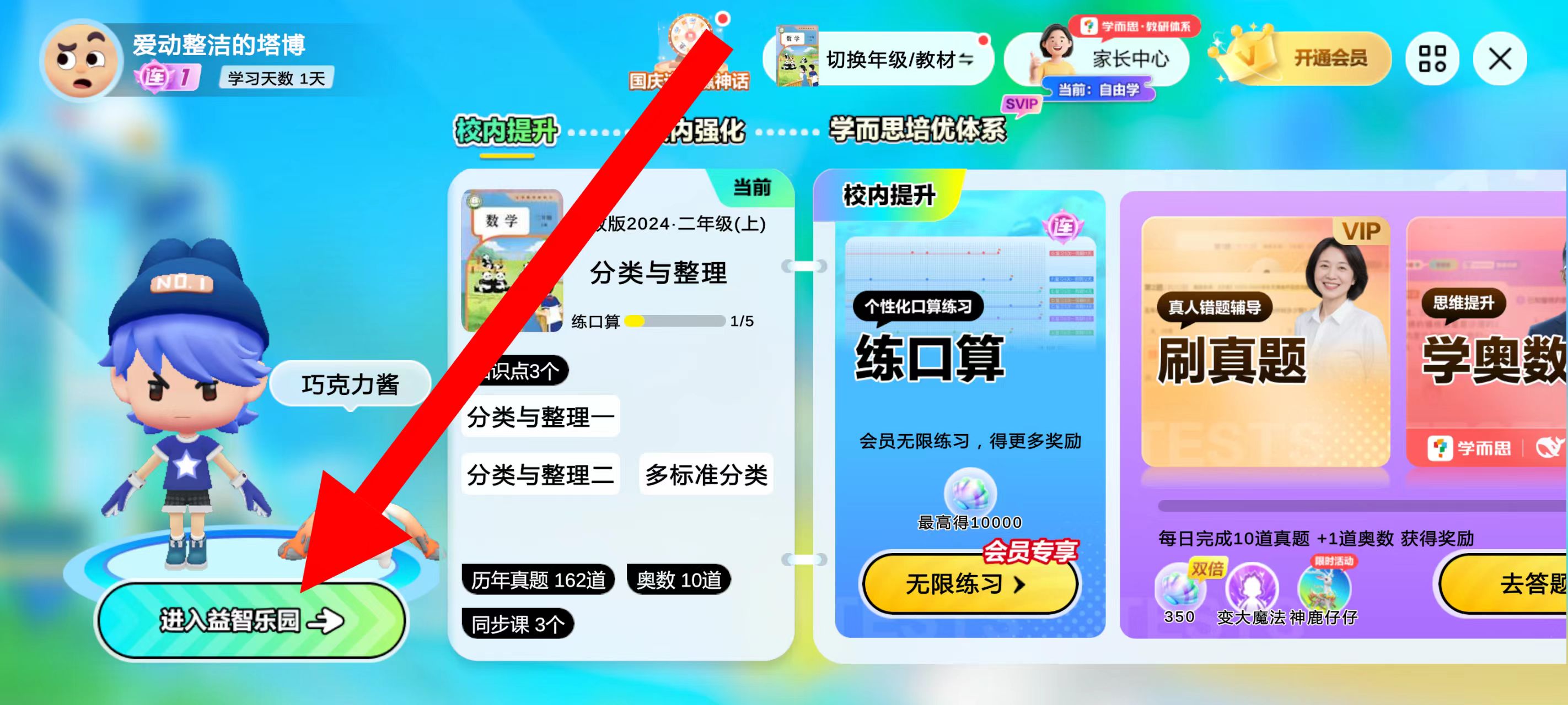 1、打开数学天天练APP,在首页点击进入益智乐园按钮。