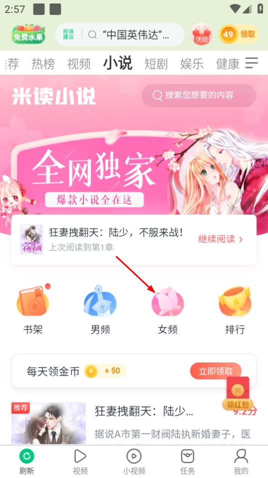 2、在小说页面,若想浏览女频小说,可点击女频按钮。