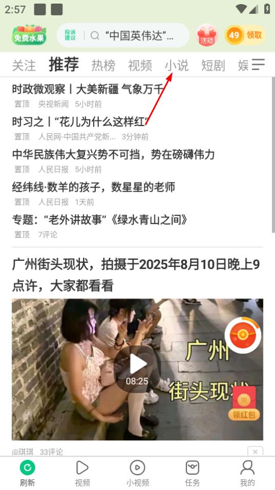 1、进入趣头条,若想查看小说,可点击页面上方的小说选项。