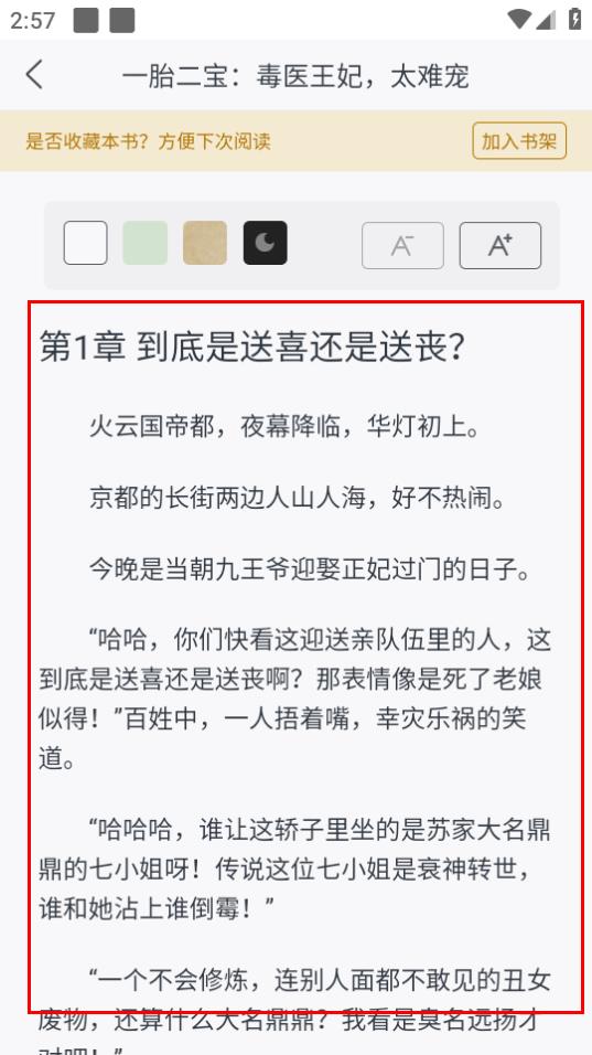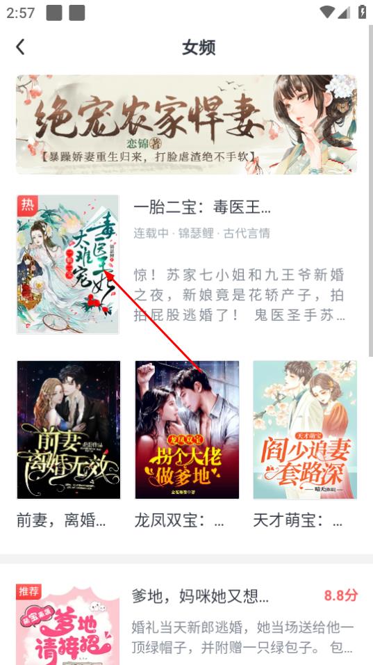 3、进入女频小说页面后,选择想要阅读的小说,比如一胎二宝毒医王妃太难宠。