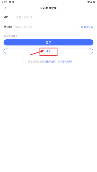 3、在vivo账号登录界面,点击注册选项,进入账号注册页。