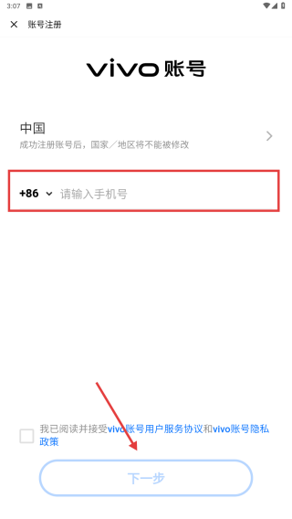 4、输入手机号码,勾选同意用户服务协议和隐私政策后,点击下一步按钮,继续完成注册流程。