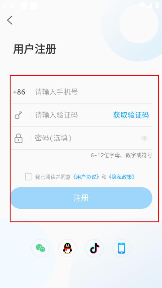 4、在用户注册页面,输入信息勾选协议后,点击注册按钮即可。