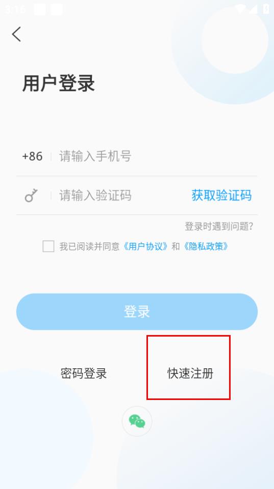 3、在用户登录界面,点击快速注册进行注册操作。
