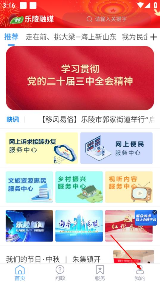 1、进入乐陵融媒,若要进行注册操作,可点击页面右下角我的。