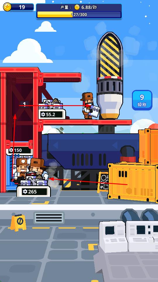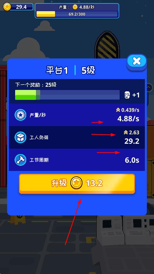 1、可对平台进行升级,消耗金币提升平台等级,增加产量/秒、调整工人负荷和工作周期等属性。