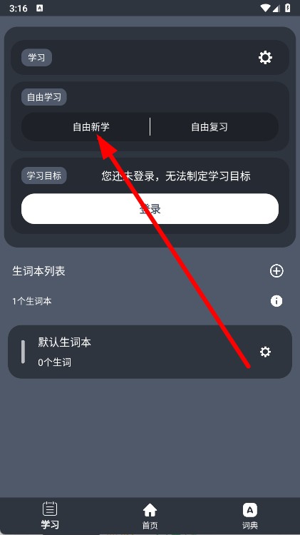 1、打开英汉随身词典APP,在学习页面点击自由新学选项。