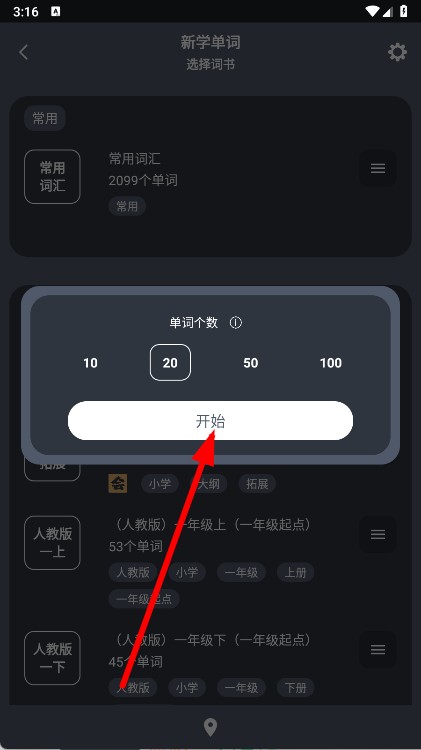 3、在弹出的单词个数选择框中,挑选要学习的单词数量,然后点击开始。