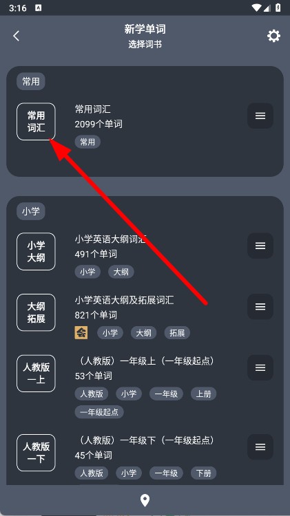 2、进入新学单词页面后,选择词书,如常用词汇等分类词库。