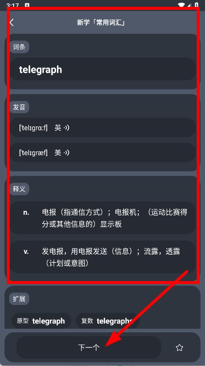5、学习完毕后点击下一个继续学习,后续可通过首页生词本入口,复习收藏的单词。