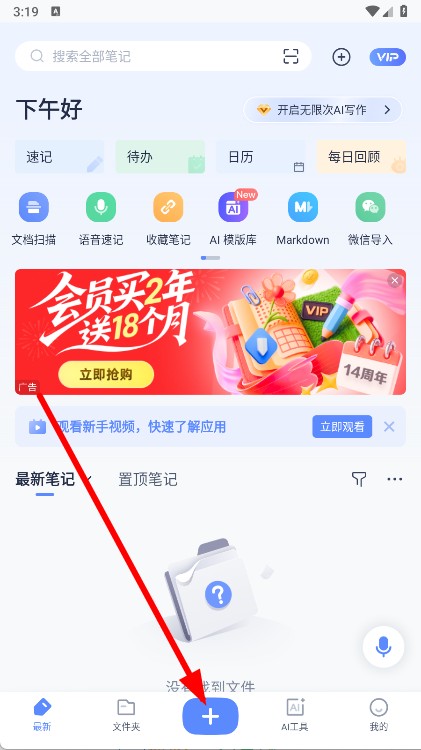 1、打开APP,进入首页后,点击底部中间的+按钮,开始创建新笔记。
