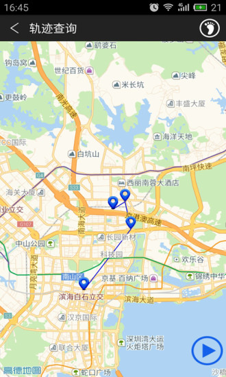 6.轨迹查看:查看老人每天的活动轨迹,知道他一天去了哪些地方。老人外出也可以实时跟进,不用担心他(她)偏离方向。