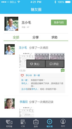 帮帮糖app糖友版是一款专为糖尿病患者打造的在线血糖监控,手机问诊的健康应用,实时监控血糖变化,让健康常伴,更能认识更多新糖友,面对糖尿病你不再孤单,欢迎下载体验。