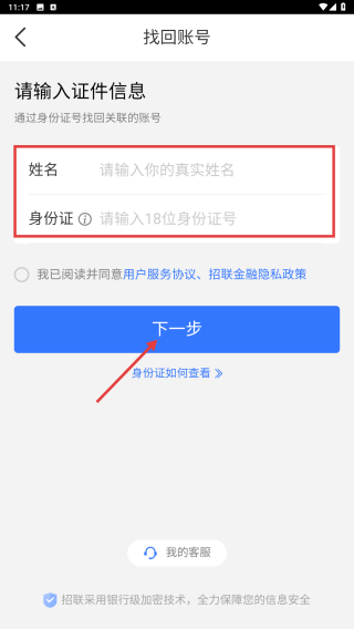 4、在找回账号页面,输入姓名和身份证号码,点击下一步按钮,继续完成账号找回流程。