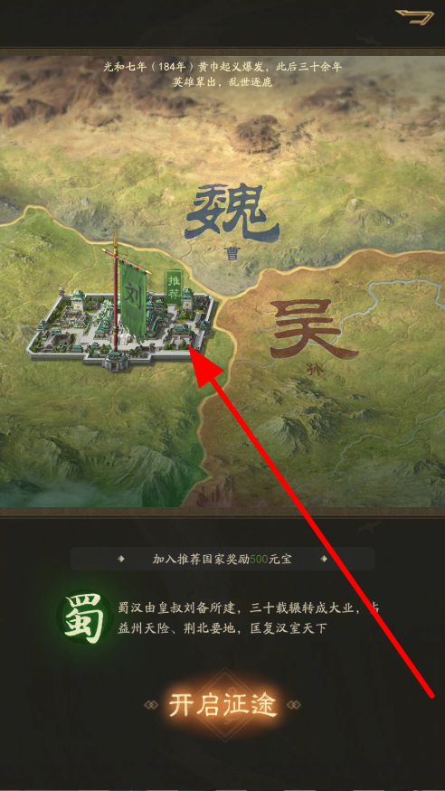 1、新人进入游戏,选择势力阵营,如蜀汉,了解其背景后,点击开启征途,投身到三国的纷争与建设中。