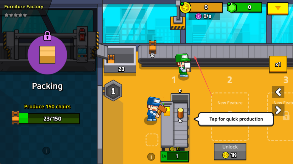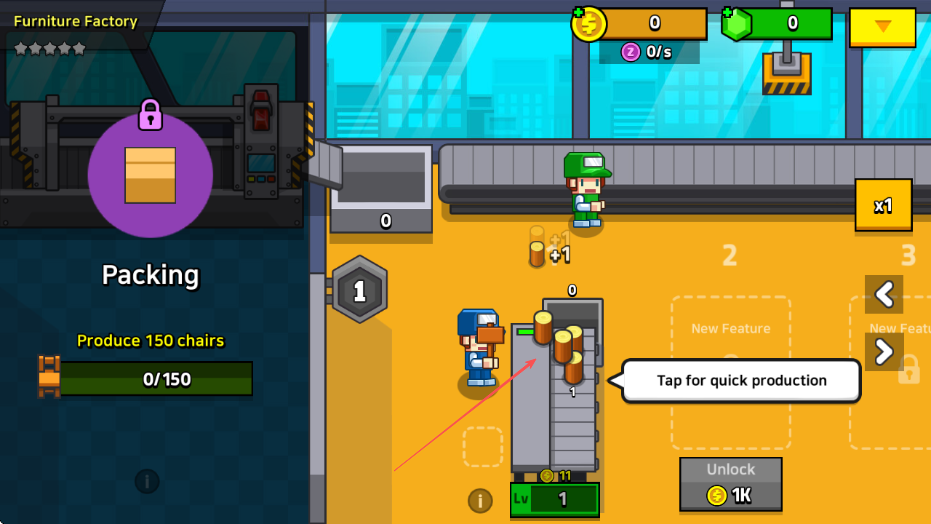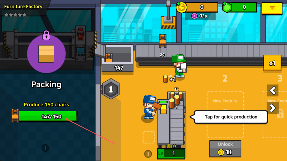 1、进入游戏Furniture Factory界面,明确任务Produce150chairs,点击工人加快椅子生产。