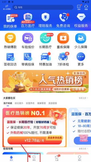 1、打开保险类应用,点击底部保险选项,进入保险商城页面。
