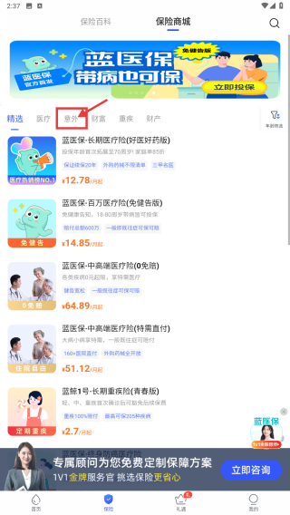 2、在保险商城页面,点击意外分类标签,浏览意外保险产品列表。