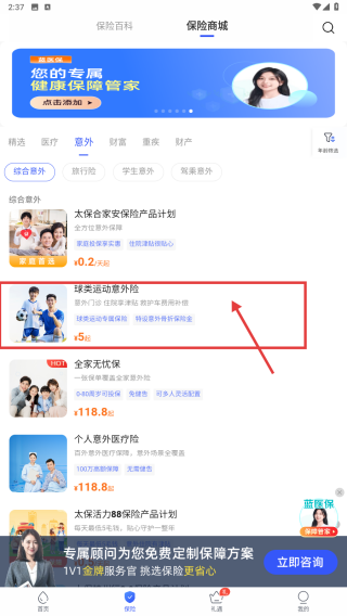 3、在意外保险列表中,找到球类运动意外险产品,点击进入详情页。