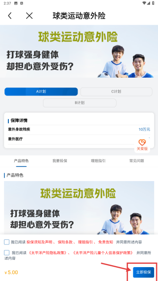 4、在球类运动意外险详情页,点击立即投保按钮,开始投保操作。