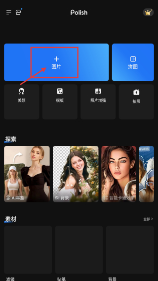 1、打开Polish图片编辑应用,点击图片按钮,导入需要编辑的图片素材。