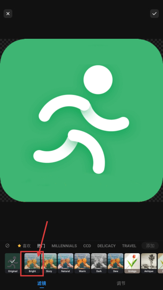 4、在滤镜列表中,选择Bright滤镜,调整图片效果,完成编辑操作。