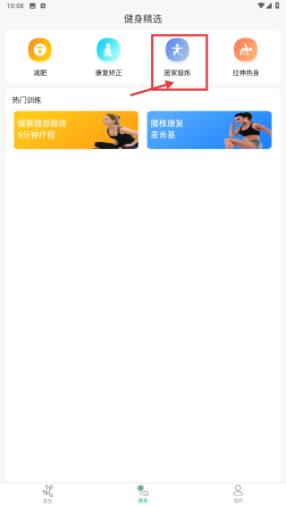 2、在健身精选页面,点击居家训练标签,浏览居家训练课程列表。