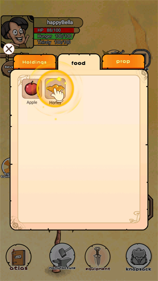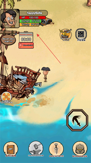 1、进入游戏查看角色happyBella状态栏了解HP,Hunger,Thirsty数值关注生存状态。