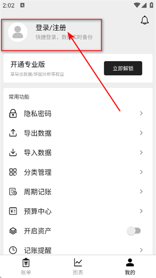 1、在首页账单页面,点击底部我的,进入个人页面。