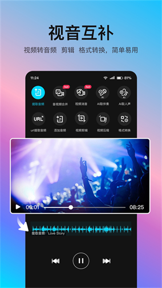 3、专属作品制作:支持用户自由组合素材、调整参数,结合个人创意对音视频进行个性化加工,打造具有独特风格的专属音乐作品,展现创作能力。