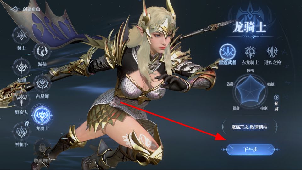 1、进入角色创建界面,选择职业,比如龙骑士等,然后点击下一步,完成角色创建,开启在神火大陆的冒险。