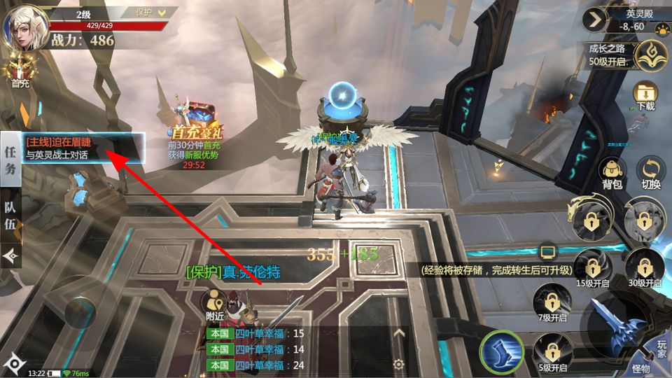 2、新手玩家接着在游戏场景中,跟随主线任务指引,像与英灵战士对话等,推进主线任务,逐步探索游戏世界。