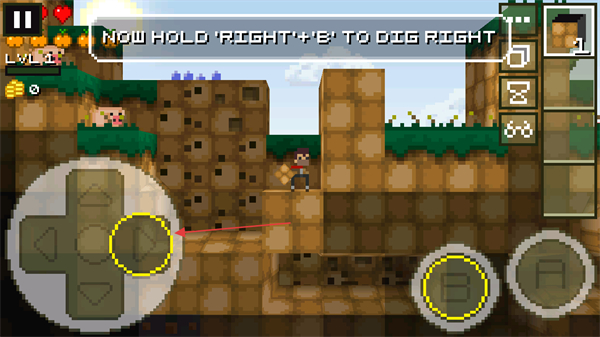 1、进入游戏,根据提示NOWHOLDRIGHT+BTODIGRIGHT,点击左下角方向键和右下角B键进行挖掘。
