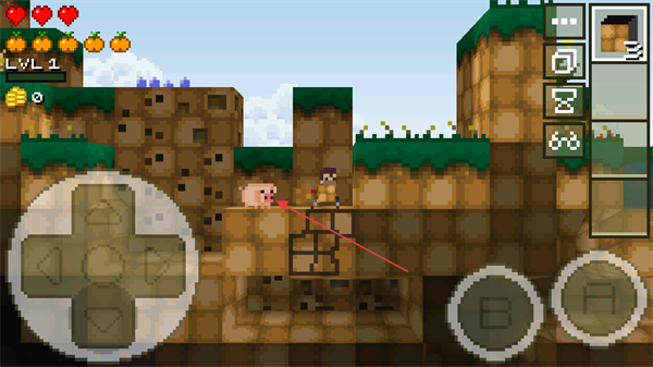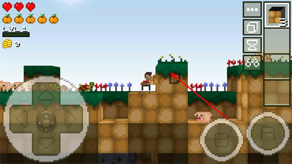 3、遇到小猪等生物时,小心躲避或利用道具应对,避免角色受伤,注意左上角红心代表的生命值。