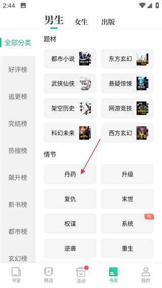 2、在书库页面,选择喜欢的题材并点击,如丹药情节。